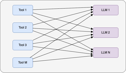 Say you have around M functions/tools in your platform that are to be available for “N LLMs” (OpenAI, Claude, Gemini, etc). You would have to manage MxN implementations (i.e., you have to implement support for calling each function/tool for each LLM)