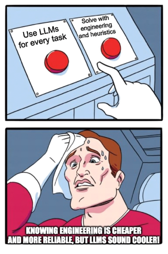 - Can the problem be solved using reliable engineering solutions? Many problems could be simplified and the solutions can be made more reliable by opting to engineering solutions rather than relying on LLM.